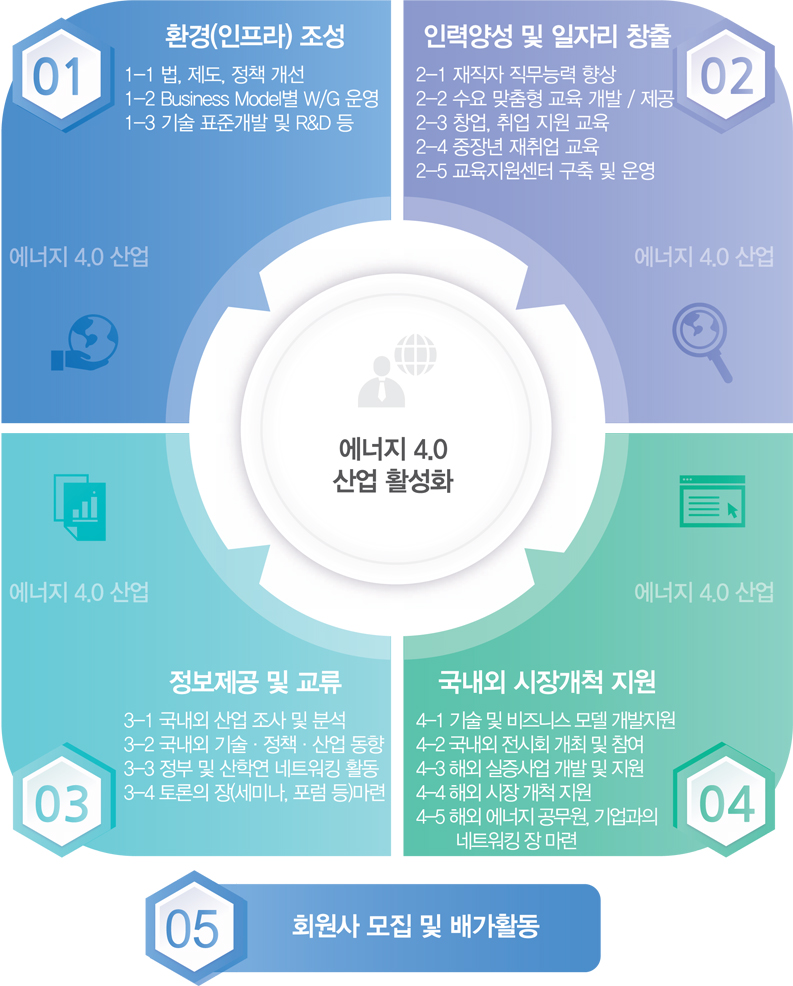 에너지 4.0 산업 환경(인프라) 조성, 인력양성 및 일자리 창출, 정보 제공 및 교류, 국내외 시장개척 지원 등 역할을 통해 에너지 4.0 산업 생태계 구축, 활성화에 기여하고자 함